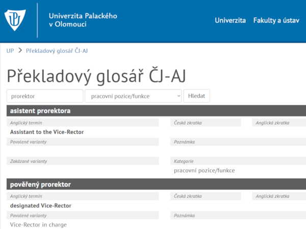 Nevíte, jak správně anglicky napsat název některé organizační jednotky na UP, akademické funkce nebo pojmu z akademického prostředí? Využijte online Překladový glosář ČJ-AJ. Díky rozsáhlé aktualizaci nyní obsahuje na 950 hesel.