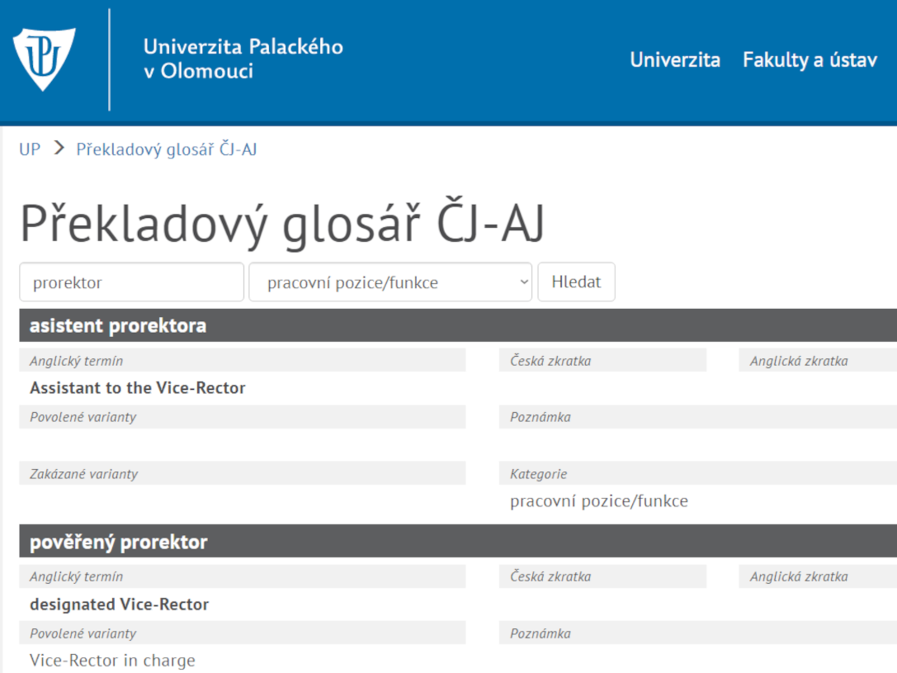 Překladový glosář je k dispozici na Portálu UP (po přihlášení) mezi odkazy v dolním menu, na webu pro zaměstnance UP v menu Praktické rady / Překladový glosář ČJ-AJ nebo přímo na adrese upol.cz/glosar.